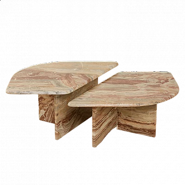 Coppia di tavolini in marmo provenienti dall’Italia e datati agli anni ’70-’80. La forma irregolare e l’altezza diversa permettono di creare composizioni differenti. I piani sono arrotondati sul bordo e poggiano su una base triangolare sempre di marmo. Buone condizioni, presentano qualche segno dato dall’età e dall’uso. Il tavolino più grande misura 40 cm di altezza, 103 cm di lunghezza e 57 cm di profondità. Il tavolino più piccolo misura 36 cm di altezza, 103 cm di lunghezza e 57 cm di profondità.
