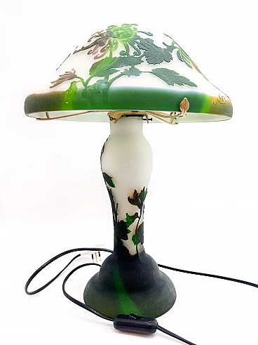 Lampada francese in vetro Tip-Gallè, composta da doppia luce, una nel cappello e una nella base, realizzata negli anni '40.