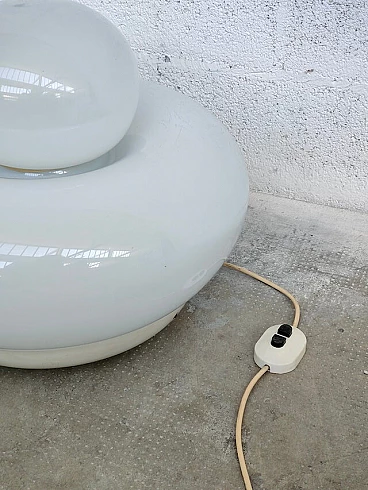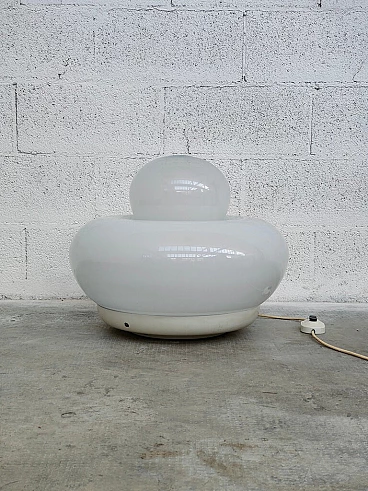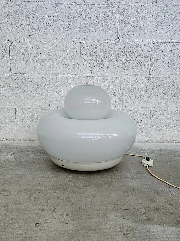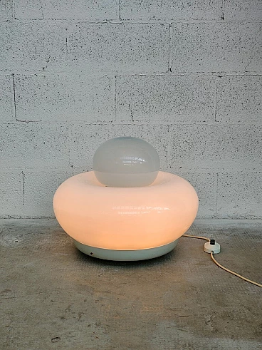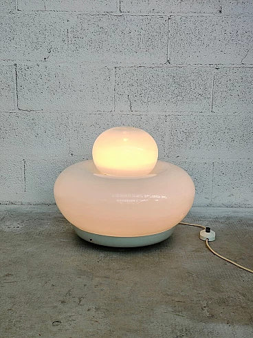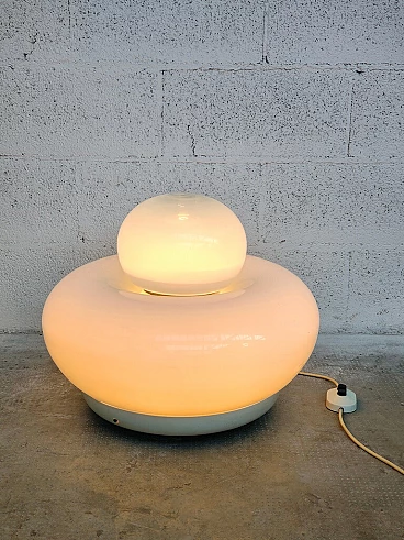 Questa lampada da tavolo è stata disegnata da Giuliana Gramigna per Artemide - Italia - ed è stata prodotta da Artemide in Italia nel 1968. Presenta una grande base rotonda in vetro bianco e un piano più piccolo e arrotondato in vetro più chiaro. La lampada può essere utilizzata come plafoniera.