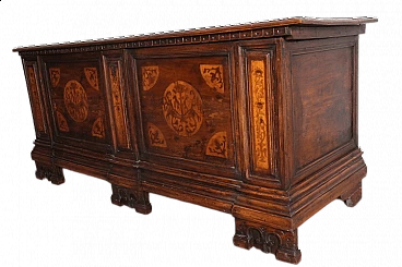 Antica cassapanca in ciliegio massello risalente al XVII secolo, Lombardia. Presenta un frontale intarsiato in acero a motivi e gambe finemente lavorate. Perfettamente restaura mantiene la patina originale di finitura a cera. Interno rivestito con carta antica ripulita e conservata. Presenza di chiodi antichi su tutta la superficie. Lunghezza 169 cm, altezza 72 cm, profondità 55,50 cm.