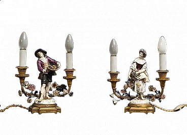 Coppia di lampade da tavolo in porcellana di Meissen policroma e bronzo dorato finemente cesellato. Le due figure centrali sono raffigurate con abiti dell'epoca mentre reggono in mano dei cesti pieni di fiori. Lateralmente vi sono due braccia portacandele contornate da fiori sempre in porcellana e terminanti con dei cestini in bronzo finemente cesellati. La base è di forma ottagonale sempre in bronzo dorato. Realizzate in Francia tra 1880 e 1890.