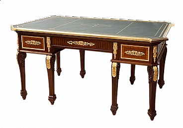 Descrizione: Scrivania Napoleone III Francese in legni esotici pregiati con profilatura in bronzo dorato e piano in pelle. La fascia sottopiano è caratterizzata da tre cassetti adornati con belle bocchette in bronzo dorato finemente cesellato. Otto piedi a groppa d'asino reggono tutta la struttura e sono impreziositi dalla presenza di foglie d'acanto in bronzo dorato finemente cesellato. L'altra faccia risulta essere speculare a quella principale. Condizioni: Restaurata dai nostri maestri artigiani con metodo tradizionale gommalacca e alcool fatto a mano. Provenienza: Francia XIX secolo. Misure: 152x88 H78cm. Documento: Certificato di Autenticità. Assistenza: Siamo a vostra disposizione per ulteriori chiarimenti o particolari fotografici