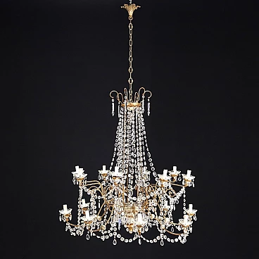 Lampadario in stile a 15 luci, Italia prima metà XX secolo. Struttura in metallo dorato con motivi a ricciolo; bobeches, collane e pendenti in vetro.