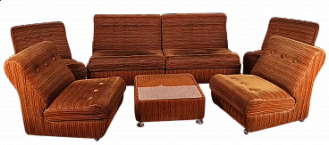Salotto componibile con doppio divano letto, 4 poltrone con ruote e tavolino, anni '70