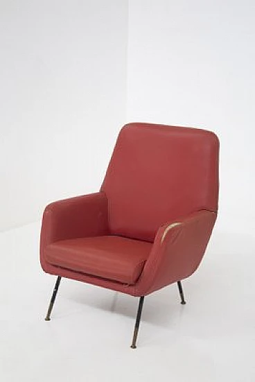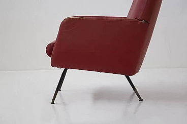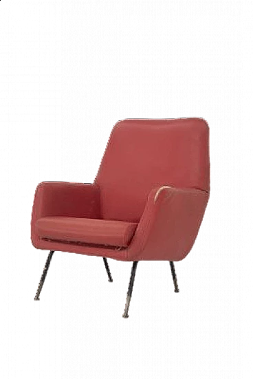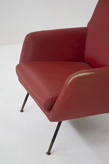 Il corpo della poltrona, invece, vede una seduta, realizzata con un cuscino in pelle. Due caratteristici braccioli geometrici si collegano0 allo schienale, che assume una forma trapezoidale. Pelle originale dell'epoca.