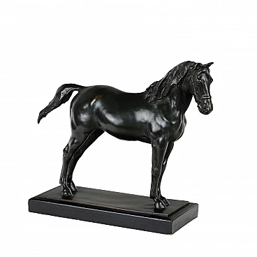 Scultura in bronzo raffigurante cavallo con base in legno a patina scura. La cura dei particolari evidenzia una buona capacità scultorea dell'artista anonimo. Oggetto in buone condizioni, presenta piccoli segni di usura.