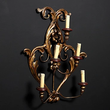 Grande applique in stile antico in lamierino dorato, 5 luci, Italia inizio XX secolo. Struttura a volute con elementi floreali. Reggi luci in legno laccato. Lampada che a causa dell'età e dell'usura può richiedere interventi di restauro e, probabilmente, presenta un impianto di elettrificazione non adeguato alle norme vigenti.