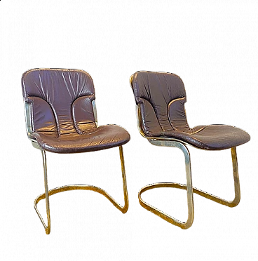 Splendida coppia di sedie disegnate da Willy Rizzo per Cidue nel 1970. La struttura in acciaio cromato effetto ottone ospita una seduta di pelle marrone removibile in perfette condizioni originali. Marchiate sotto. Dimensioni 45×80×44 cm.