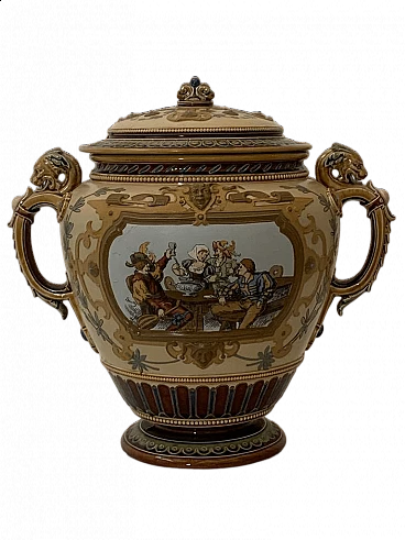 Prestigiosa ciotola per punch finemente dipinta con scene allegoriche di taverna, eccezionale lavoro di modellazione e intaglio per rilievi di cornici e grottesche prodotta da Villeroy & Boch. L'azienda di ceramica è stata fondata nel 1836 a Mettlach, la prima fase erano esemplari pezzi di alta qualità e da collezione poi trasformatasi come è conosciuta la sua produzione di stoviglie. Firmato, siglato e datato sotto la base.