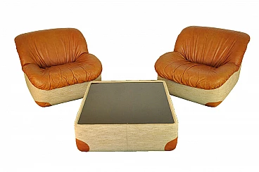 Coppia di poltrone e tavolino, in cuoio e tessuto, anni '70