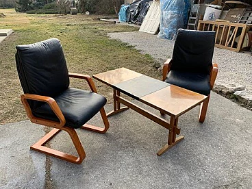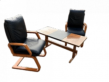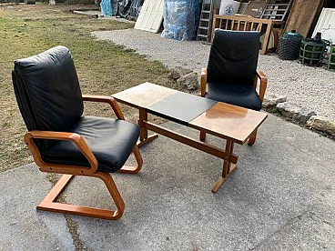 Coppia di poltrone e tavolino in legno e pelle, anni '60