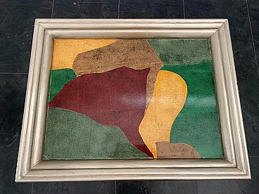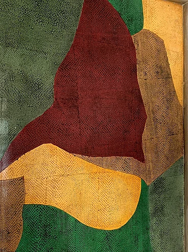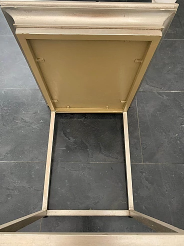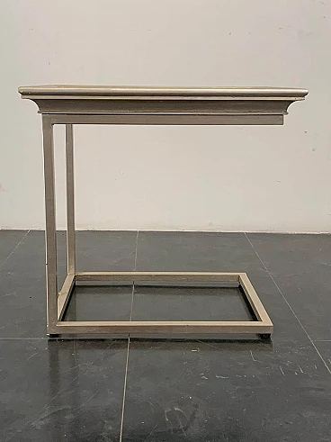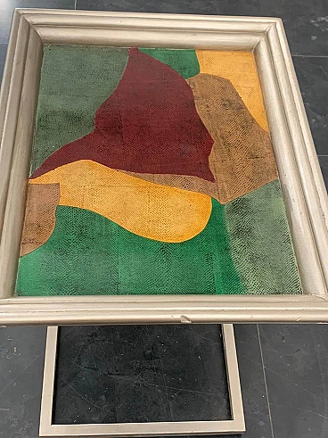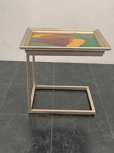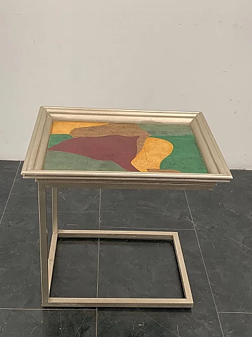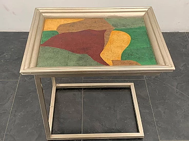 Tavolino in metallo con piano a vassoio laccato a pezze filiformi policrome, anni '70