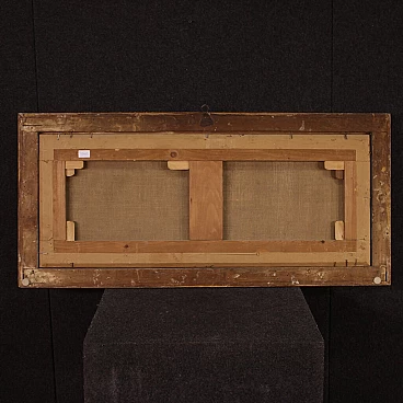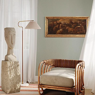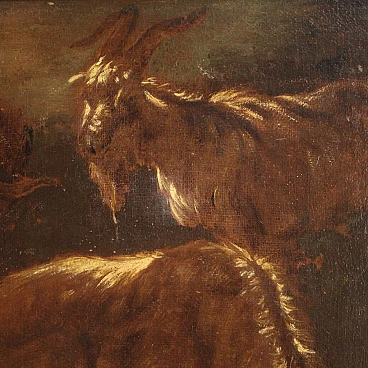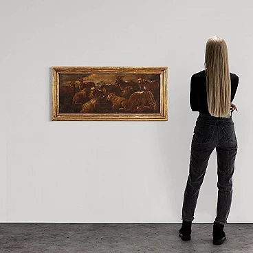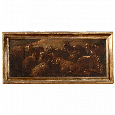 Antico dipinto italiano della seconda metà del XVII secolo. Opera olio su tela raffigurante particolare soggetto Animali al pascolo di buona mano pittorica nello stile di Rosa da Tivoli. Quadro che si sviluppa in orizzontale, di interessante misura e proporzione, adornato da cornice lignea antica, non coeva, scolpita e dorata. Opera facilmente inseribile in diversi punti della casa, per antiquari, arredatori e collezionisti di quadri di genere. Dipinto caratterizzato da una tonalità scura che raffigura numerosi caproni e un bovino disteso in basso a destra (vedi foto). Opera che ha subito un intervento di restauro conservativo, rintelo, sostituzione del telaio e ripresa del colore in alcuni punti (vedi foto). Dipinto facente parte di un pendant (vedi foto e richiedi il prezzo della coppia se disponibile). In buone condizioni. Luce dipinto H 37,5 x L 97,5 cm.