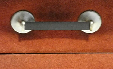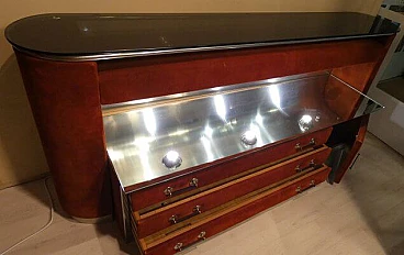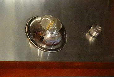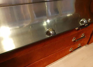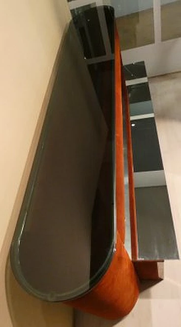 Mobile consolle in suede composto da due pezzi, con ripiano in vetro fumè ed elemento a specchio. Perfettamente rifinito e conservato, riflette in pieno lo stile anni '70. Il mobile non presenta difetti di alcun tipo ed è integro in ogni sua parte. Due sono gli elementi che lo compongono: il primo è quello superiore con il piano in vetro e sostegno in tubolare di acciaio, il secondo è l'elemento basso con il ripiano specchiato, sul quale si riflettono una volte accese, le luci inserite nel primo. Il mobile dispone di tre ampi cassetti e di un vano con anta a battente. Le maniglie e la ferramenta sono originali dell'epoca. Il colore è molto particolare, una via di mezzo fra il color granata ed il vermiglio scuro.