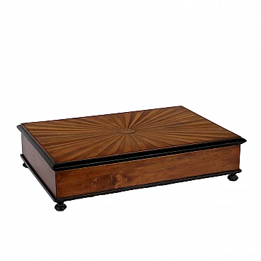 Grande scatola in legno di rovere, abete, acero e altre essenze con decoro a raggiera sopra il coperchio. All'interno vani e decoro con gattino sotto il coperchio. Oggetto in buone condizioni, presenta piccoli segni di usura.