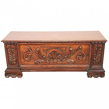 Imponente maestosa cassapanca antica realizzata in pregiato legno di noce massello epoca prima metà del secolo XX in stile rinascimento. Sul fronte elaborata decorazione ad intaglio conchiglia centrale e foglie d'acanto. Usata ma in ottime condizioni presenta piccoli segni di usura ma generali buone condizioni. Prezzo trattabile inviate le vostre proposte di acquisto.