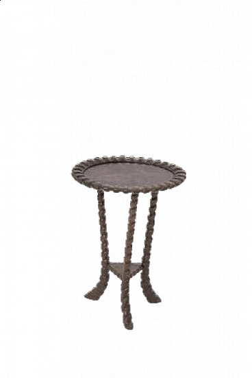 Bellissimo tavolo antico dei primi del '900 in legno, molto elegante. Il tavolo è realizzato interamente in legno scuro, finemente lavorato. Ci sono tre gambe lavorate con una tecnica molto particolare a intreccio, davvero bella. Le gambe sono collegate da un triangolo di legno. Il piano è rotondo e liscio, incorniciato da una fascia intrecciata. Il tavolo può essere utilizzato anche come sgabello, meraviglioso.