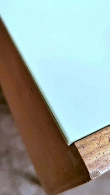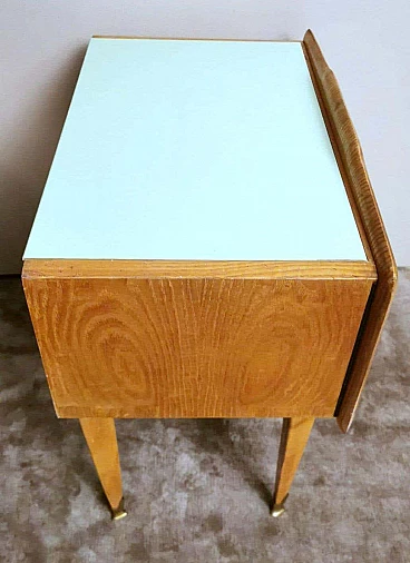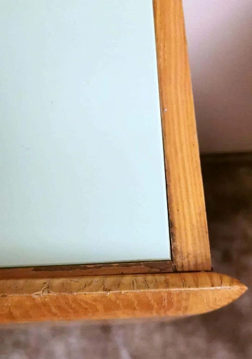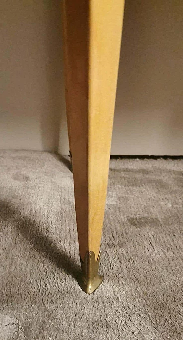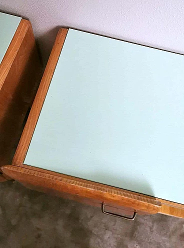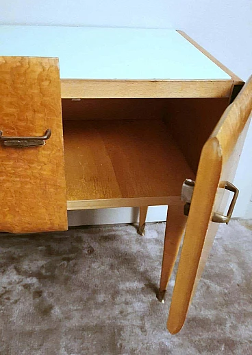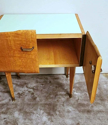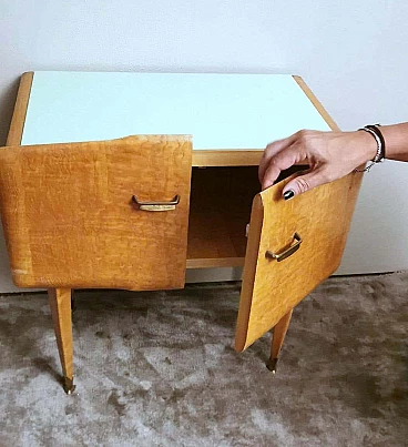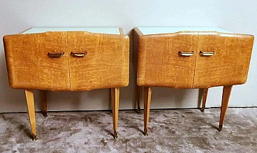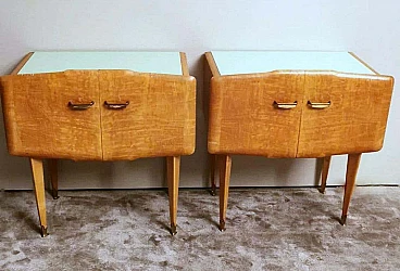 Coppia di originali e singolari comodini in legno d'acero laccato; l'ampio spazio inferiore di ciascun comodino è racchiuso da due ante elegantemente arrotondate, le ante, dotate di maniglie in ottone, sono state realizzate in modo che la loro altezza superi di poco il piano in vetro, creando così un comodo e raffinato dislivello. Le gambe sono a sezione triangolare e si rastremano verso il basso, molto graziosa e caratteristica è la protezione in ottone all'estremità, le gambe, con la loro linearità pura e spigolosa, contrastano piacevolmente con il design curvilineo dei comodini, il piano è in vetro e il colore verde chiaro non è stato apposto sulla superficie ma è stato amalgamato con la fusione del vetro stesso (pasta di vetro), che quindi non può usurarsi o cambiare colore nel tempo. Gli artigiani hanno trattato il legno di acero con antiche tecniche di levigatura, verniciatura e lucidatura, esaltando così i cromatismi, le fiammature e le venature di questo bellissimo legno. Lo stile dei comodini è quello degli anni '50 che afferma un immaginario futuristico, senza ornamenti superflui, molto minimale. Sono stati realizzati artigianalmente tra il 1950 e il 1953 a Meda, in provincia di Monza e Brianza, in Lombardia, località famosa per l'industria del design e per la storica produzione artigianale di mobili classici e moderni; tutti i parametri dei comodini ci portano ad attribuirli con buona certezza al famoso designer italiano Ico Parisi. Ico Parisi (Palermo 1916 - Como 1996) è stato uno dei protagonisti della cultura comasca del '900; dal 1936 lavora presso l'importante Studio Terragni, dove conosce e frequenta noti personaggi dell'architettura e dell'arte comasca; tra il 1948 e il 1950 Ico Parisi si dedica allo studio dell'arredamento e del design del mobile, e nel 1951 inizia amicizie e collaborazioni con artisti, designer e architetti come Lucio Fontana, Bruno Munari, Mario Radice e Gio Ponti. Queste relazioni influenzano profondamente il suo approccio all'architettura e al design di mobili ed esemplificano il desiderio di Ico Parisi di integrare una sintesi delle arti nel suo lavoro. A metà degli anni Cinquanta, Parisi è diventato uno dei designer di mobili più influenti d'Italia, con un'estetica moderna e unica che utilizza legni dolci spesso modellati in ampie curve ondulate e rivestimenti dai colori vivaci. Ico Parisi è una figura "umanistica" di artista-artista di difficile collocazione, fu architetto e designer ma anche fotografo, regista e pittore, insomma un artista a 360 gradi; morì a Como il 19 dicembre 1996. Larghezza 56 cm, profondità 33 cm, altezza 56 cm. I comodini sono in buone condizioni. Per tutte le spedizioni utilizziamo materiali di imballaggio speciali (casse di legno, polistirolo, ecc.) per la massima protezione e sicurezza degli oggetti.