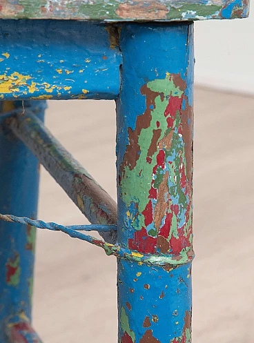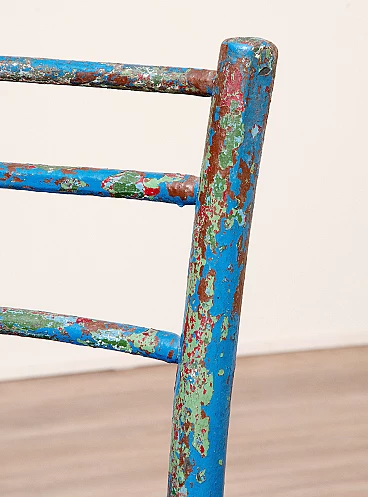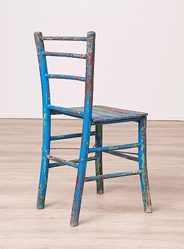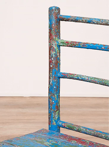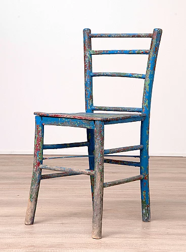 Sedia pollock colorata. Una sedia di campagna blu con diversi strati di vernice gialla, verde e rossa. Design semplice: quattro gambe snodate con barelle laterali multiple e un sedile a cinque assi.