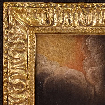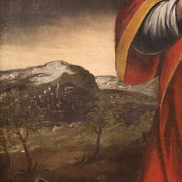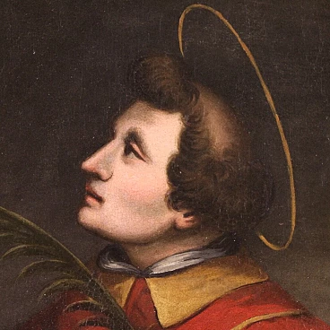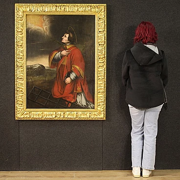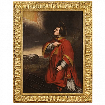 Antico dipinto italiano del XVII secolo. Opera olio su tela raffigurante soggetto religioso San Lorenzo di buona mano pittorica. Quadro di grande misura e impatto adornato da cornice del XX secolo in legno e gesso, scolpita e dorata, di bella decorazione. Opera che si sviluppa in verticale, piacevole il paesaggio con città sullo sfondo (vedi foto). Santo rappresentato in primo piano con la palma del martirio tra le mani e la graticola ai suoi piedi (vedi foto). Opera che ha subito un intervento di restauro conservativo, rintelo, sostituzione del telaio e ripresa del colore in diversi punti (vedi foto). Dipinto in buone condizioni con qualche segno del restauro. Luce dipinto H 101 x L 73 cm.
