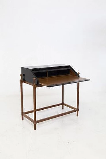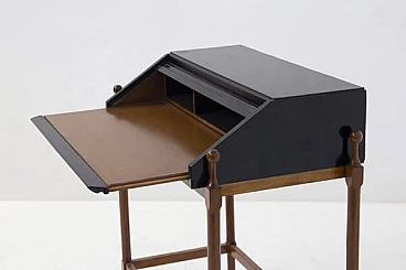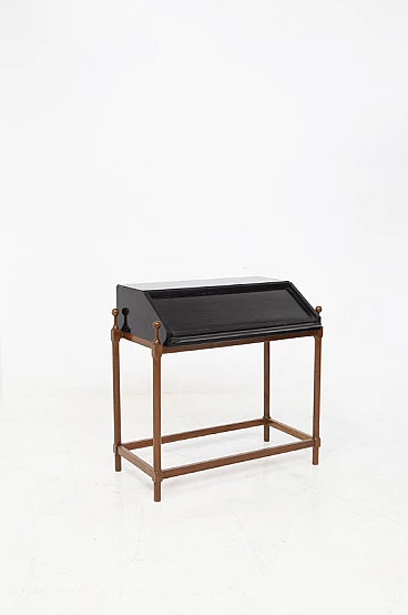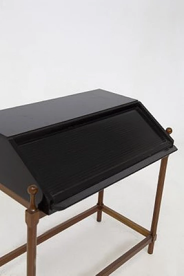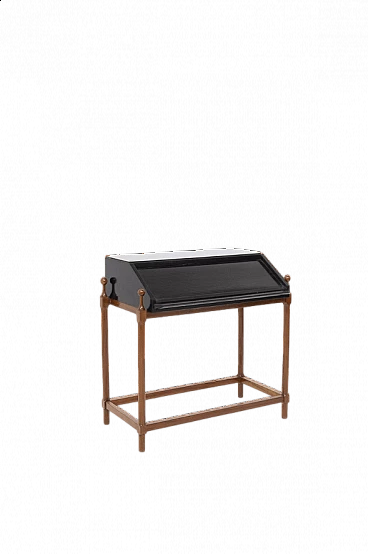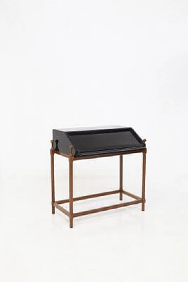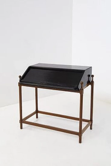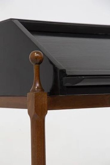 Al centro, nella parte superiore, si trova il piano di lavoro in legno laccato nero lucido, che attraverso un meccanismo scorrevole permette di aprire il piano di scrittura.