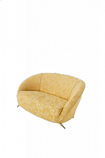 Raro e bellissimo divano d'epoca attribuito al grande designer Gio Ponti per la pregiata manifattura Isa Bergamo negli anni '50. Il divano ha 4 piedi d'appoggio in ottone punzonato, leggermente ricurvi, tipico stile Ponti. Il divano è completamente foderato in un tessuto giallo canarino con un motivo floreale ricamato in bianco. Il divano ha una forma molto graziosa, infatti si curva leggermente per avvolgere chi vi si siede, donandogli un comfort unico. La seduta è alta e morbida. Il divano è ideale per arredare piccoli soggiorni o sale importanti e fantasiose.