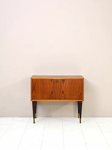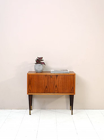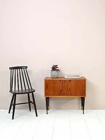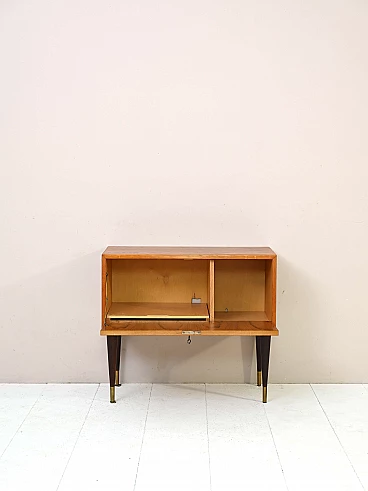 Mobiletto porta dischi vintage in teak anni ’60. L’unicità di questo pezzo è data dalla forma singolare della struttura. L’anta, dotata di serratura, si apre a ribalta e le lunghe gambe affusolate sono arricchite dal puntale in ottone. Perfetto come comodino o come mobile per l’ingresso. Buone condizioni. È stato effettuato un restauro conservativo con prodotti di origine naturale. Potrebbe presentare dei segni del tempo. Per piacere prestare attenzione alle foto.
