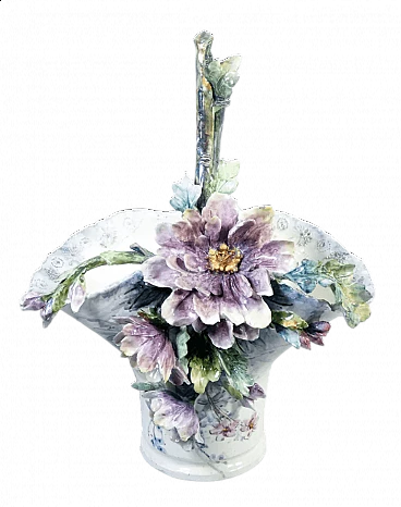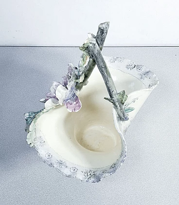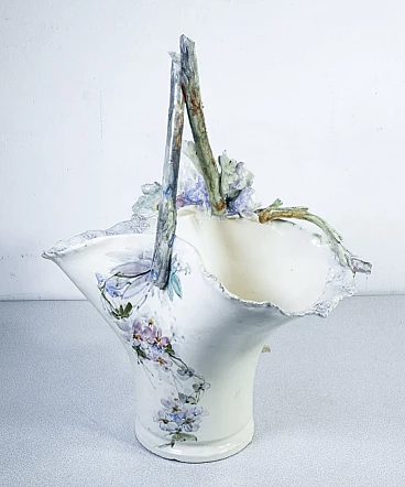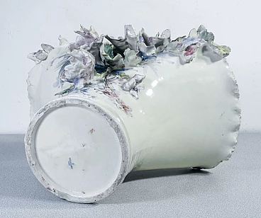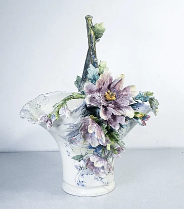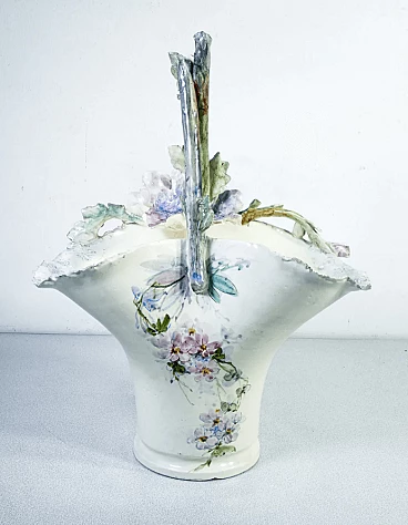 Vaso francese in ceramica barbotine con fiori e foglie, primo '900