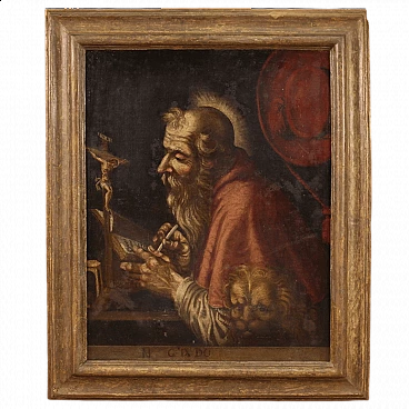 Dipinto a olio su tela raffigurante San Girolamo nel suo studio, realizzato in Italia nel '600. Ricco di dettagli tra cui il leone, il libro, il cappello cardinalizio e il crocifisso. Il dipinto ha subito un intervento di restauro conservativo, rintelo, sostituzione del telaio e ripresa del colore in alcuni punti. Cornice antica, non coeva, scolpita, laccata e adattata al dipinto; presenta qualche segno del tempo e una piccola mancanza lignea nell'angolo in alto a destra. Il dipinto senza la cornice misura 73 cm x 57 cm.