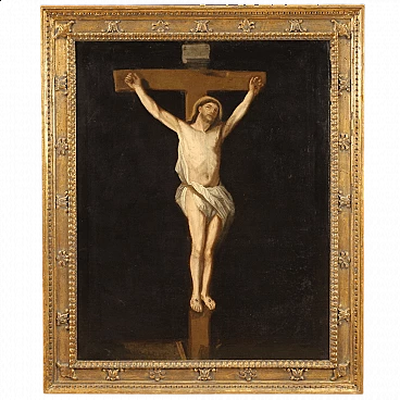 Antico dipinto italiano della fine del XVII secolo. Opera olio su tela raffigurante soggetto religioso Cristo crocifisso di buona mano pittorica. Quadro di ottima misura adornato da cornice del XX secolo scolpita e dorata. Opera a fondo scuro caratterizzata da un sapiente utilizzo della luce, di forte impatto visivo, per antiquari, arredatori e collezionisti di arte sacra antica. Dipinto che ha subito un intervento di restauro conservativo, rintelo, sostituzione del telaio e ripresa del colore in diversi punti (vedi foto). In buone condizioni con qualche segno del restauro. Luce dipinto H 98 x L 78 cm.