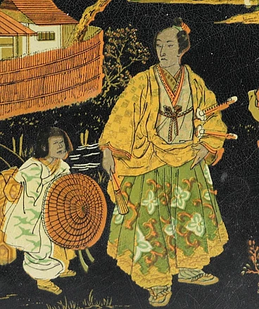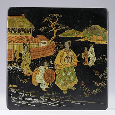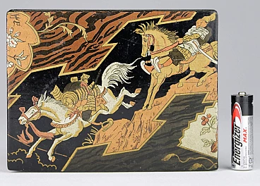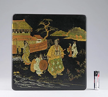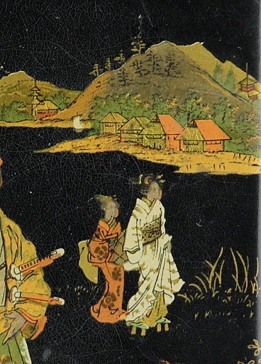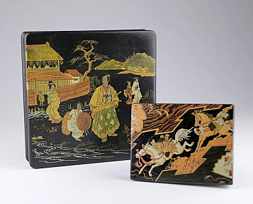 Coppia di scatole in cartapesta laccata Pont à Mousson con samurai e geishe, '800