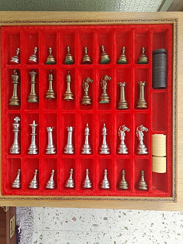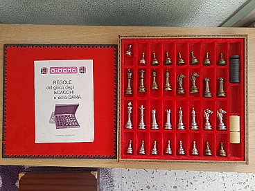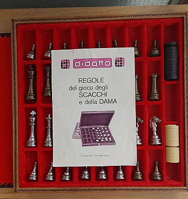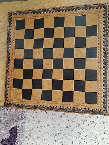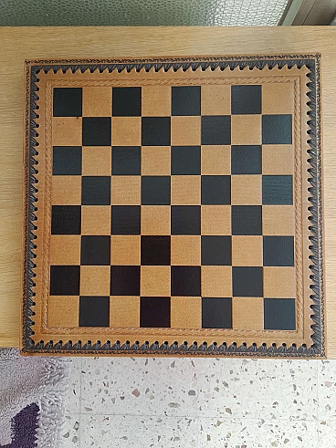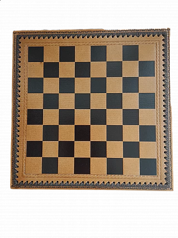 Scacchiera in pelle con pedine per dama e pezzi per scacchi, anni '80