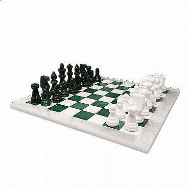 Scacchiera con pezzi in alabastro di Volterra verde e bianco, anni '70