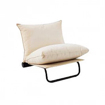 Rara poltrona risalente agli anni '70 in metallo verniciato e cotone, disegnata da LO Design per l'azienda italiana Elam. La poltrona ha una struttura molto particolare: ci sono infatti due piedi unici, uno anteriore e uno posteriore. Quello anteriore è una fascia tubolare di metallo verniciato nero che si incurva verso il basso, dando un effetto molto moderno. Quello posteriore, invece, è una struttura tubolare cilindrica molto spessa in metallo verniciato nero. Dal piede posteriore al centro parte una struttura tubolare più stretta su cui poggia un'altra struttura identica, perpendicolare all'ultima. Le strutture sono ricoperte da un sottile strato di cotone resistente su cui sono appoggiati due cuscini molto grandi e morbidi, anch'essi foderati in cotone bianco, molto belli. La poltrona è adatta ad ambienti moderni e vintage, se abbinata correttamente. La poltrona è in buone condizioni originali con lievi graffi e una leggera usura, coerente con il l'età e l'uso. Tessuto originale.