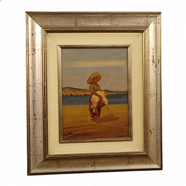 Dipinto olio su masonite del XX secolo. Quadro spagnolo firmato in basso a destra. Opera raffigurante personaggio di buona mano pittorica. Cornice in legno argentato con passepartout in buone condizioni. Presenta un vetro protettivo integro. Nel complesso in buono stato conservativo. Luce dipinto: H 39 x L 29 cm.