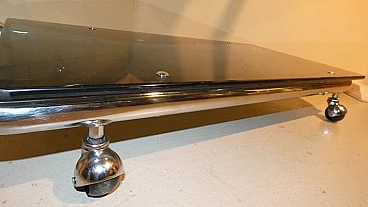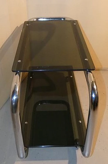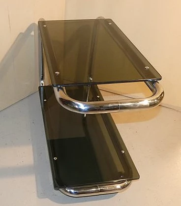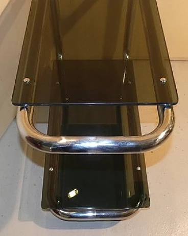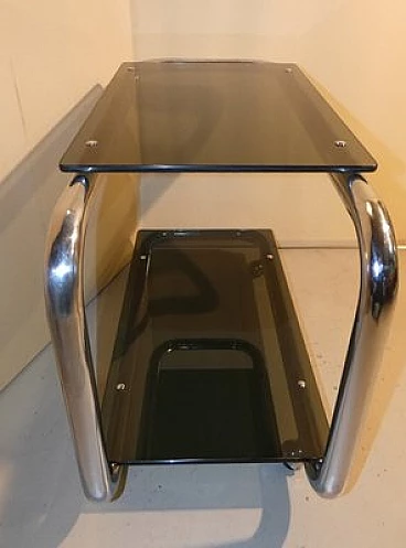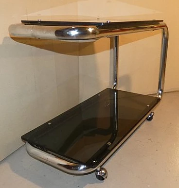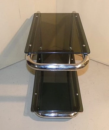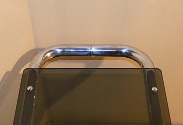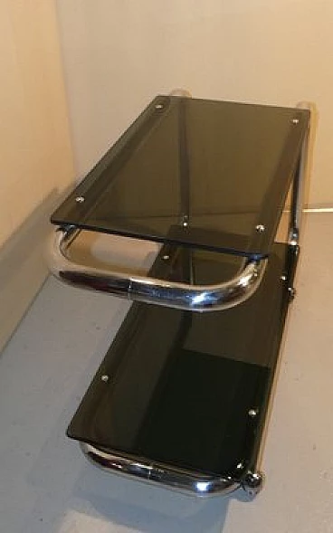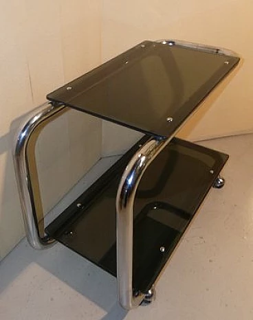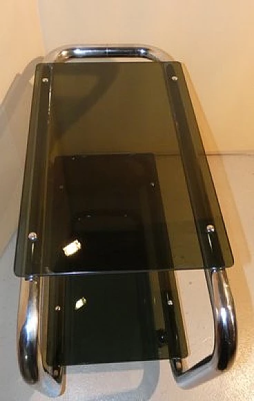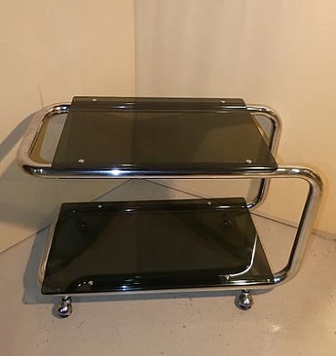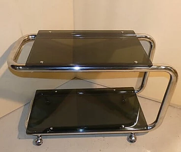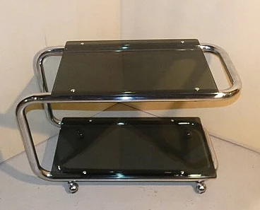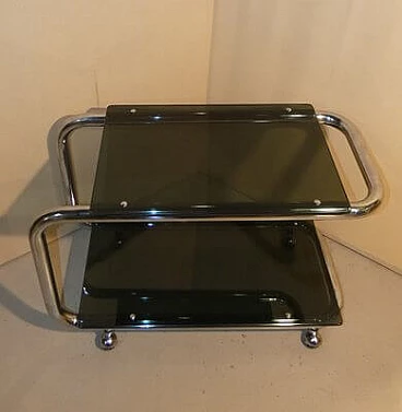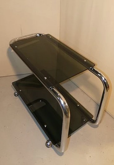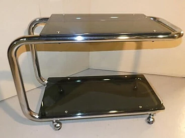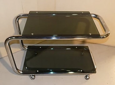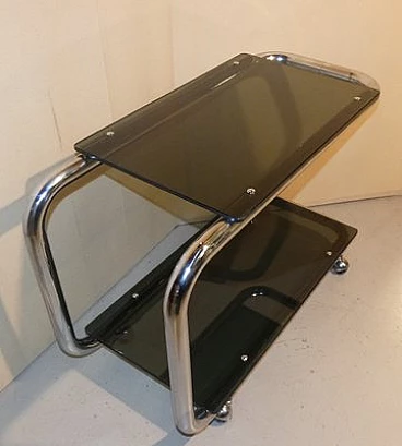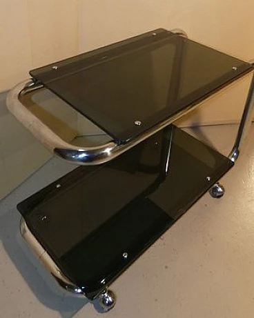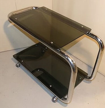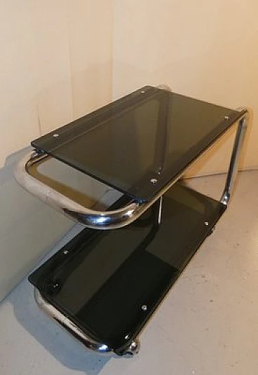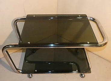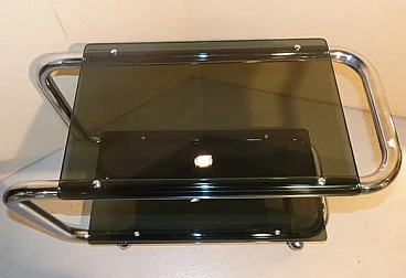 Carrello in acciaio e vetro, Italia, anni ‘70. Carrello tipico degli anni ’70 realizzato in tubolare di acciaio cromato con sezione tubolare da 4 cm e con piani in vetro fumè. Il vetro fumè temprato ha uno spessore di 10 mm. Le ruote snodate ruotano su cuscinetti a sfera.