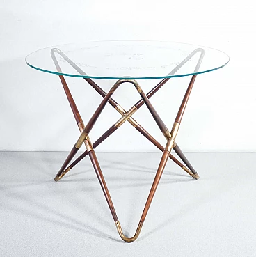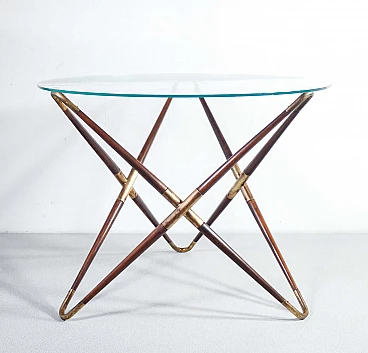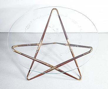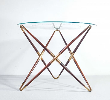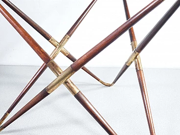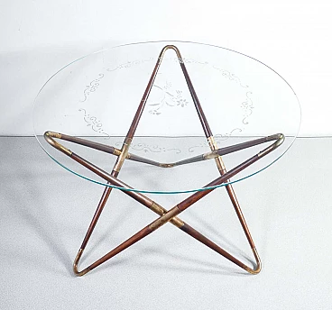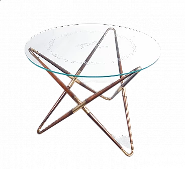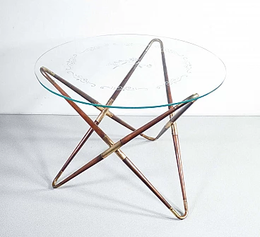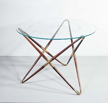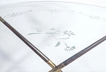 Tavolino in legno e ottone con piano in vetro decorato di Cesare Lacca, anni '40