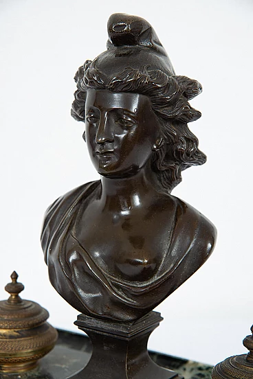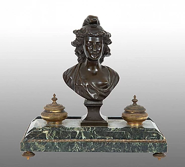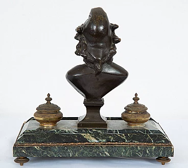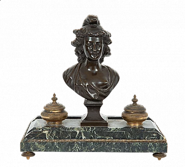 Calamaio Impero in bronzo e marmo verde Alpi, realizzato in Francia nell'800. Sulla base in marmo, decorata da un profilo e piedi in bronzo, sono posti una scultura mitologica in bronzo brunito e lateralmente due calamai in bronzo dorato finemente cesellati.