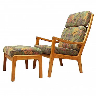 Bellissima poltrona lounge 'Senator' con schienale alto e pouf in teak massiccio e tessuto colorato. Segnato.