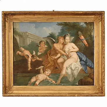 Antico dipinto francese del XVIII secolo. Opera olio su tela raffigurante soggetto mitologico Amore e Psiche di ottima mano pittorica. Quadro di grande misura e impatto adornato da cornice in legno e gesso non coeva, adattata al dipinto, scolpita e dorata. Dipinto di ottima luminosità e favoloso arredamento per antiquari, arredatori e collezionisti di pittura mitologica antica. Opera che rappresenta Amore e Psiche abbracciati sulle sponde di un fiume, intorno a loro alcuni elementi di vegetazione e putti alati che giocano. Sullo sfondo architetture classiche e cielo azzurro (vedi foto). Quadro di grande piacevolezza, facilmente inseribile in diversi punti della casa. Opera che ha subito un intervento di restauro conservativo, rintelo, sostituzione del telaio e ripresa del colore in alcuni punti (vedi foto). Cornice con alcuni segni di restauro, dipinto nel complesso in buone condizioni. Luce dipinto H 72 x L 90 cm.
