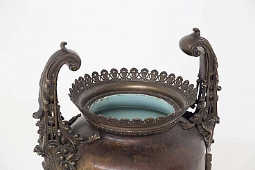 Grande vaso in bronzo dipinto Liberty dei primi del '900, di raffinata manifattura italiana. Il vaso ha una base rotonda con quattro piedi spessi e sinuosi, che ricordano quelli delle vecchie stufe. I quattro piedi sono grandiosamente decorati: infatti, oltre a incurvarsi molto delicatamente, si nota anche un particolare trattamento del bronzo, con lavorazioni e scanalature. La cornice della base sembra essere ricamata con un motivo a cerchi molto fine e delicato. Al di sopra di questa sottile cornice ne vediamo un'altra, anch'essa sferica, ma molto più massiccia e appariscente. Al di sopra di questa si nota un restringimento che crea la base vera e propria del vaso. Il corpo centrale del vaso, anch'esso di forma imponente, è realizzato in ceramica. Qui notiamo uno splendido dipinto che mostra l'incontro di due giovani, un uomo e una donna, probabilmente innamorati. Lei è dipinta in una posa molto aggraziata, con una lunga veste color crema e uno scialle rosa. Lui, invece, si avvicina alla damigella, posandole una mano sulla spalla, esemplificando un gesto intimo che fa pensare a una relazione amorosa. Entrambi sono raffigurati con un copricapo, che sembrerebbe risalire al 1600. La scena è incorniciata da cespugli di fiori bianchi e rosa, a indicare la purezza dell'amore. Più in alto sul lato si vedono i due manici utilizzati per spostare il vaso da un luogo all'altro: l'attacco è costituito dal volto di quello che sembrerebbe un uomo con la barba lunga, dalla cui testa si erge il sinuoso manico in bronzo. L'intero manico ricorda una natura morta, con foglie molto delicate. Il collo del vaso reca un'altra cornice in bronzo molto bella. All'interno si nota un colore verde acqua molto chiaro. Il grande vaso Liberty è adatto a spazi sontuosi. Usura coerente con l'età e l'uso. Il vaso è in buone condizioni originali d'epoca, con lievi graffi.