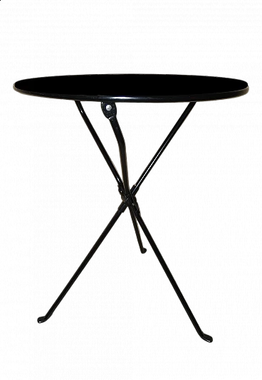 Tavolino pieghevole Cumano di Achille Castiglioni per Zanotta, anni '70. Struttura e piano in acciaio verniciati di nero e giunto scorrevole in ABS. Il piano presenta un foro che può essere usato per appendere il tavolino una volta chiuso. Sono disponibili anche le due sedie Celestina (per ulteriori informazioni contattare direttamente il venditore).