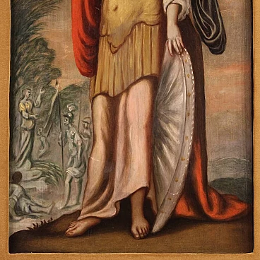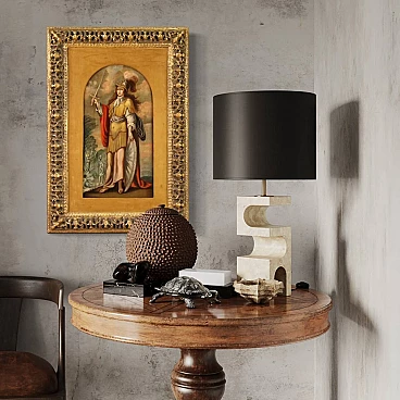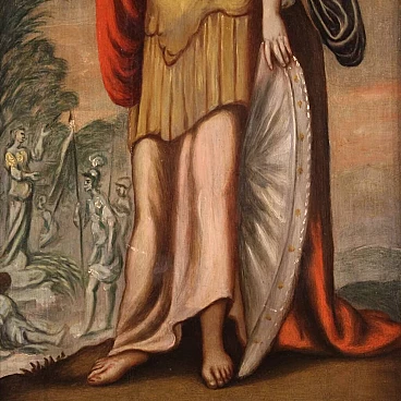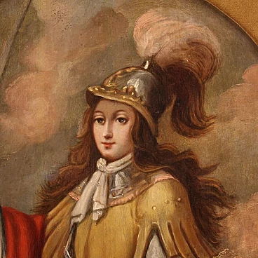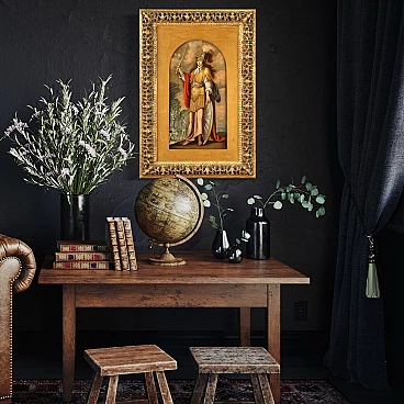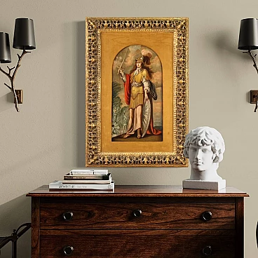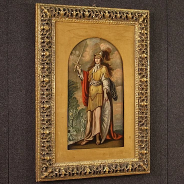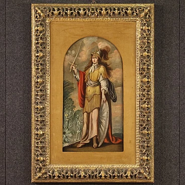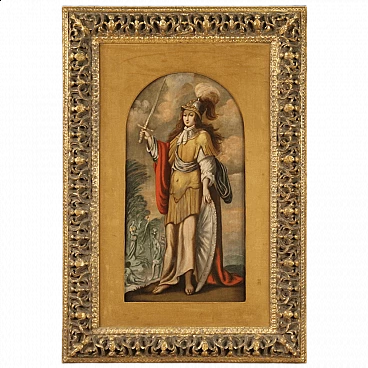 Antico dipinto francese del XVII secolo. Opera olio su tavola di ottima qualità raffigurante La femme forte Déborah, tipico soggetto in voga nella prima metà del Seicento. In questo periodo diversi celebri pittori si cimentarono nel dipingere la donna forte, quadri con soggetto femminile di diversa estrazione storica e religiosa, tra cui ricordiamo Lucrezia, Cleopatra, Ester e Giuditta. Donne spesso di alta nascita che si erano distinte per il coraggio, la bellezza e l'impegno verso gli ideali di famiglia, nazione e nobile individualità. Dipinto adornato da cornice in legno e gesso non coeva, del XX secolo, riccamente scolpita e dorata, completa di passe-partout in velluto (vedi foto). Dipinto rettangolare stondato nella parte superiore, a nicchia (vedi foto), di grande piacevolezza. Opera di ottima luminosità per antiquari, arredatori e collezionisti di pittura di genere. Tavola che ha subito un intervento di restauro conservativo, bel lavoro di palchettatura visibile sul retro (vedi foto) e ripresa de colore in alcuni punti. Dipinto nel complesso in buono stato conservativo. Luce dipinto H 60 x L 31 cm.
