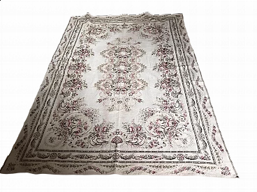 Tappeto Jacquard con disegno aubusson anni '30. Nessun difetto. Lo Jacquard è un tessuto che viene realizzato con un telaio speciale. Ideato da un certo Giovanni il calabrese, questi andò in Francia dal Re sole per proporgli l'innovativa invenzione, ma trovò ostacoli dalla corporazione dei tessitori di seta ,che avevano pauro che questa invenzione potesse togliergli il lavoro. Solo verso la fine del 1700 inizio 800 il Francese Jacquard, riprese il progetto e lo perfezionò brevettandolo. Questo tipo di telaio è stato il primo esempio di lavoro che utilizzava schede perforate, poi utilizzate anche dai primi calcolatori elettronici. Il telaio Jacquard prevedeva pur sempre la presenza di un abile artigiano per il suo funzionamento. I tessuti Jacquard sono sinonimo di grande qualità