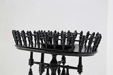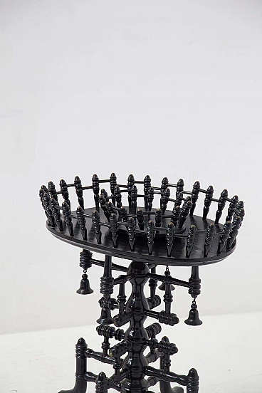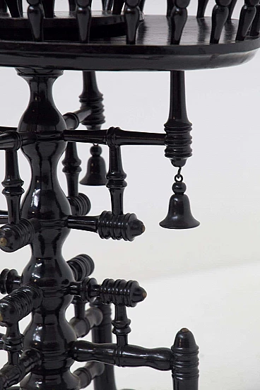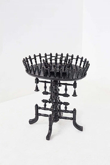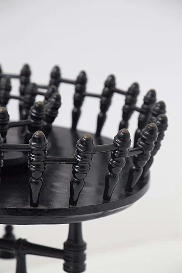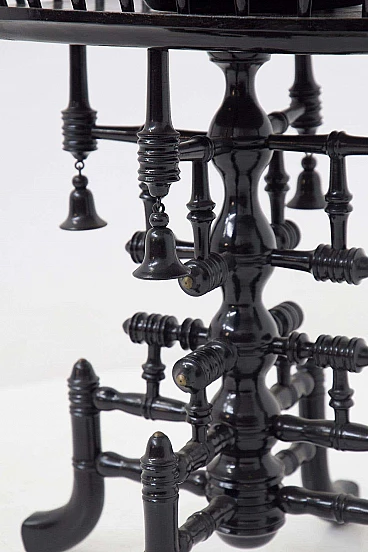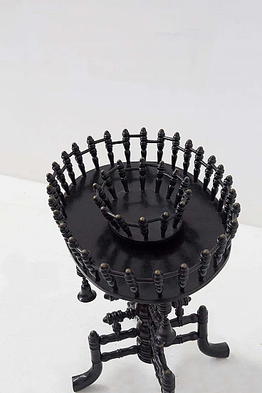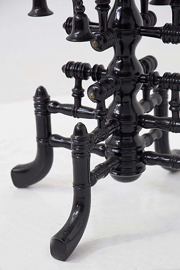 Un particolarissimo tavolino in legno ebanizzato proveniente dalla Germania del XIX secolo, di raffinata manifattura tedesca. Il tavolino è interamente realizzato in legno tornito e finemente ebanizzato. Alla base c'è un tronco centrale molto sinuoso, infatti sembra composto da tante sfere di dimensioni sempre più piccole man mano che si sale, tutte nere e lucide, davvero particolari. Alla base di questo tronco ci sono quattro gambe ricurve, finemente lavorate e lucidate; sono collegate al tronco da due piccole strutture tubolari che creano un effetto davvero squisito. Al centro di ogni sfera del tronco si trovano quattro elementi tubolari, uno per lato. Tutti questi elementi sono in ottone placcato oro e verniciato di nero. Al di sotto della sommità troviamo quattro elementi tubolari in legno che scendono verticalmente per accogliere, alla fine, una piccola campana in ottone verniciato nero, molto decorativa. Il piano ha una forma ovale il cui contorno è decorato da una sorta di recinzione formata da elementi in legno tornito ebanizzato, con punte di ottone. Al centro del piano si trova un cerchio rialzato, anch'esso racchiuso nello stesso modo. Si pensa che fosse un tavolo per gustare la birra in compagnia, dato che la Germania è sempre stata famosa per il suo nettare dorato.