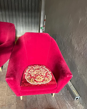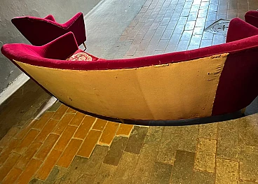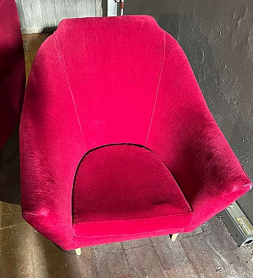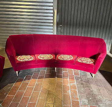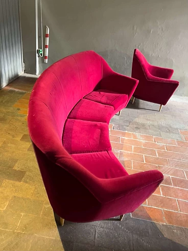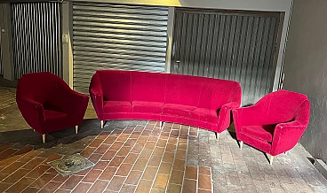 Divano a quattro posti e coppia di poltrone di Ico Parisi, anni '50. Struttura in legno e rivestimento in velluto rosso. Il divano è alto 85 cm, lungo 263 cm e profondo 86 cm. Le poltrone sono alte 85 cm, larghe 84 cm e profonde 80 cm.