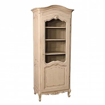 Vetrina francese del XX secolo. Mobile in legno scolpito e laccato shabby chic di piacevole arredamento. Vetrina ad un'anta munita di 4 ripiani interni posizionabili a varie altezze più piano a basamento (vedi foto) di buona capacità e servizio. Stipo completo di una chiave funzionante, anta frontale munita di vetro in perfette condizioni. Mobile facilmente inseribile in diversi punti della casa, per arredatori e amatori del mobile in stile shabby. Costruita in un unico corpo non divisibile e sostenuta da quattro gambe con piedini a ricciolo, si presenta in buono stato conservativo.