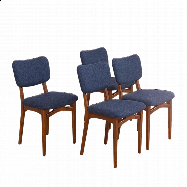 Splendido set di quattro sedie da pranzo danesi della metà del secolo scorso, risalenti agli anni '60. La struttura è in faggio massello tinto teak ben conservata, nelle sue condizioni originali. Le sedie sono state rivestite con un'imbottitura in lana naturale di colore blu intenso. Una seduta confortevole con linee geometriche ammorbidite da finiture curve che conferisce una presenza inimitabile al pezzo. La forma delle sedie è stata ispirata da vicino ai progetti di Finn Juhl dello stesso periodo. Le sedie sono in condizioni fantastiche con nuove schiume per migliorare il comfort della seduta. Altezza della seduta: 49 cm.