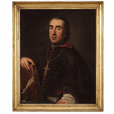 Antico dipinto italiano del XVII secolo. Opera olio su tela raffigurante soggetto religioso Ritratto di prelato di buona mano pittorica. Quadro di bella misura e piacevole arredamento adornato da cornice lignea non coeva (adattata al quadro) scolpita e dorata. Opera di grande carattere, vesti e dettagli finemente dipinti, dal calamaio sul tavolo alla bibbia tra le mani del personaggio (vedi foto). Dipinto che ha subito un intervento di restauro conservativo, rintelo, sostituzione del telaio e ripresa del colore in diversi punti (vedi foto). Quadro in buone condizioni con qualche segno del tempo. Luce dipinto H 73,5 x L 58,5 cm.