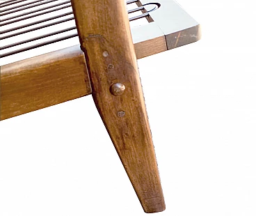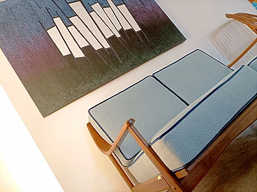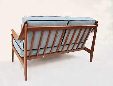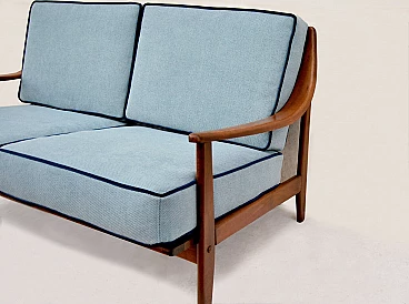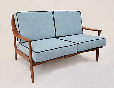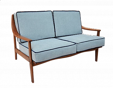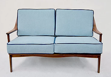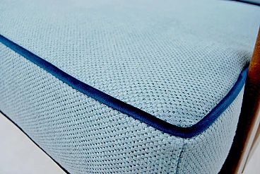 Oggetto straordinario, dal tipico design scandinavo, ha la struttura in legno di faggio massello curvato di colore marrone. Il divano è stato restaurato nella struttura e portato a nuova vita, con imbottitura in gommapiuma e rivestimento in cotone, di colore azzurro chiaro con bordature in velluto blu, completamente rifatte dal nostro team.